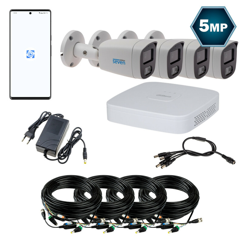 Для під'єднання камер SEVEN до відеореєстратора Dahua в комплекті передбачено кабель кручена пара з розрахунку 20 м на кожну камеру та комплекти роз'ємів живлення і спеціальних прийомопередавачів. Для зручності користувач може самостійно визначати довжину кожного кабелю для під'єднання відеокамери з огляду на особливості його об'єкта. На кабелі з боку відеокамери монтується прийомопередавач і роз'єм живлення "тато", а з боку відеореєстратора - прийомопередавач і роз'єм живлення "мама". За допомогою такого кабелю до відеокамери під'єднують BNC роз'єм прийомопередавача для передавання відео та конектор живлення "тато" для подачі на камеру живлення 12В. Другий кінець кабелю під'єднується роз'ємом BNC до відеореєстратора і роз'ємом живлення "мама" до блоку живлення. Досить просто під'єднати камеру до живлення і відеореєстратора, після чого він визначить камеру і покаже з неї зображення.