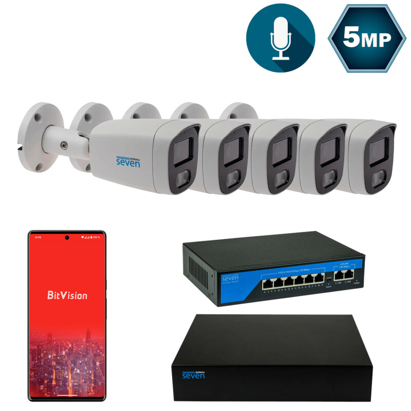 Комплект відеоспостереження на 5 циліндрични 5 Мп IP-камер SEVEN IP-7225W5-5MP