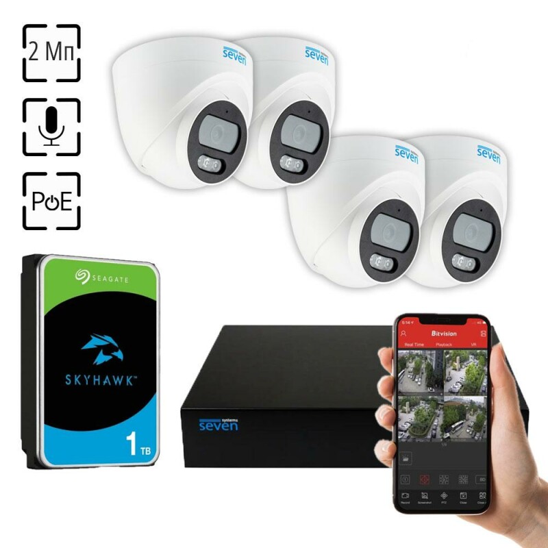 Комплект "Встанови сам" IP-відеоспостереження 2 Мп на 4 внутрішні камери SEVEN 4D2KIT з жорстким диском на 1TB