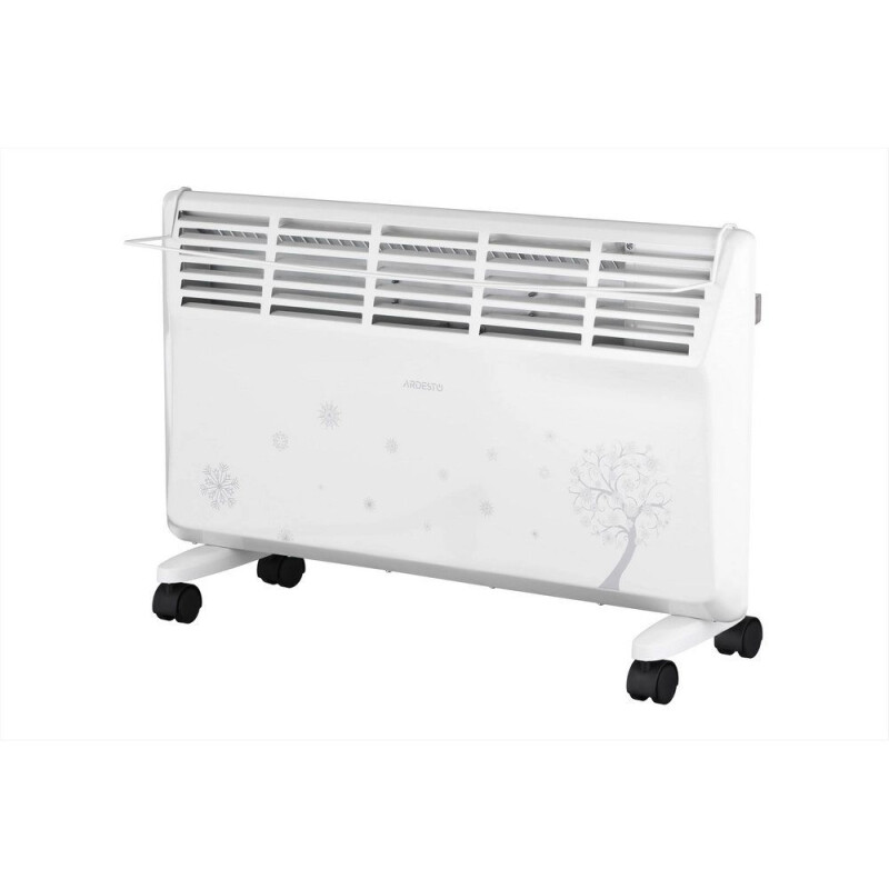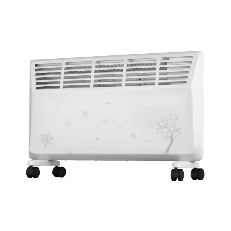 Електричний конвектор Ardesto CHB-2000MWPD з двома режимами потужності 1000/2000 Вт призначений для обігріву приміщень площею до 20 м². Постачається з контейнером для природного зволоження повітря та знімним утримувачем для сушіння речей. Передбачено захист від перегріву та перекидання. Може бути встановлений на підлогу або на стіну, кронштейни та опори з коліщатками входять до комплекту постачання.