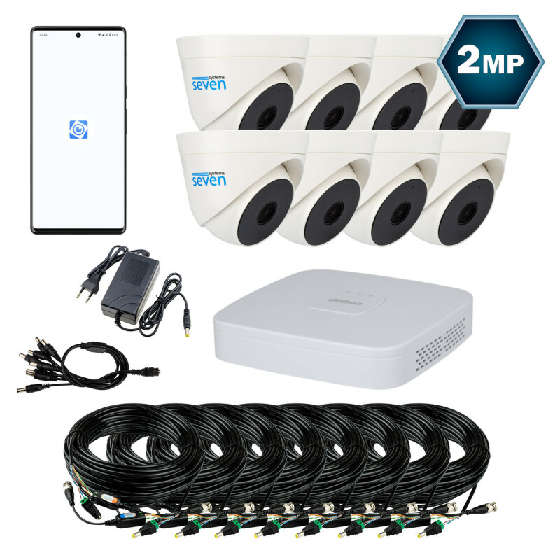 Для під'єднання камер SEVEN до відеореєстратора Dahua в комплекті передбачено кабель кручена пара з розрахунку 20 м на кожну камеру та комплекти роз'ємів живлення і спеціальних прийомопередавачів. Для зручності користувач може самостійно визначати довжину кожного кабелю для під'єднання відеокамери з огляду на особливості його об'єкта. На кабелі з боку відеокамери монтується прийомопередавач і роз'єм живлення "тато", а з боку відеореєстратора - прийомопередавач і роз'єм живлення "мама". За допомогою такого кабелю до відеокамери під'єднують BNC роз'єм прийомопередавача для передавання відео та конектор живлення "тато" для подачі на камеру живлення 12В. Другий кінець кабелю під'єднується роз'ємом BNC до відеореєстратора і роз'ємом живлення "мама" до блоку живлення. Досить просто під'єднати камеру до живлення і відеореєстратора, після чого він визначить камеру і покаже з неї зображення.